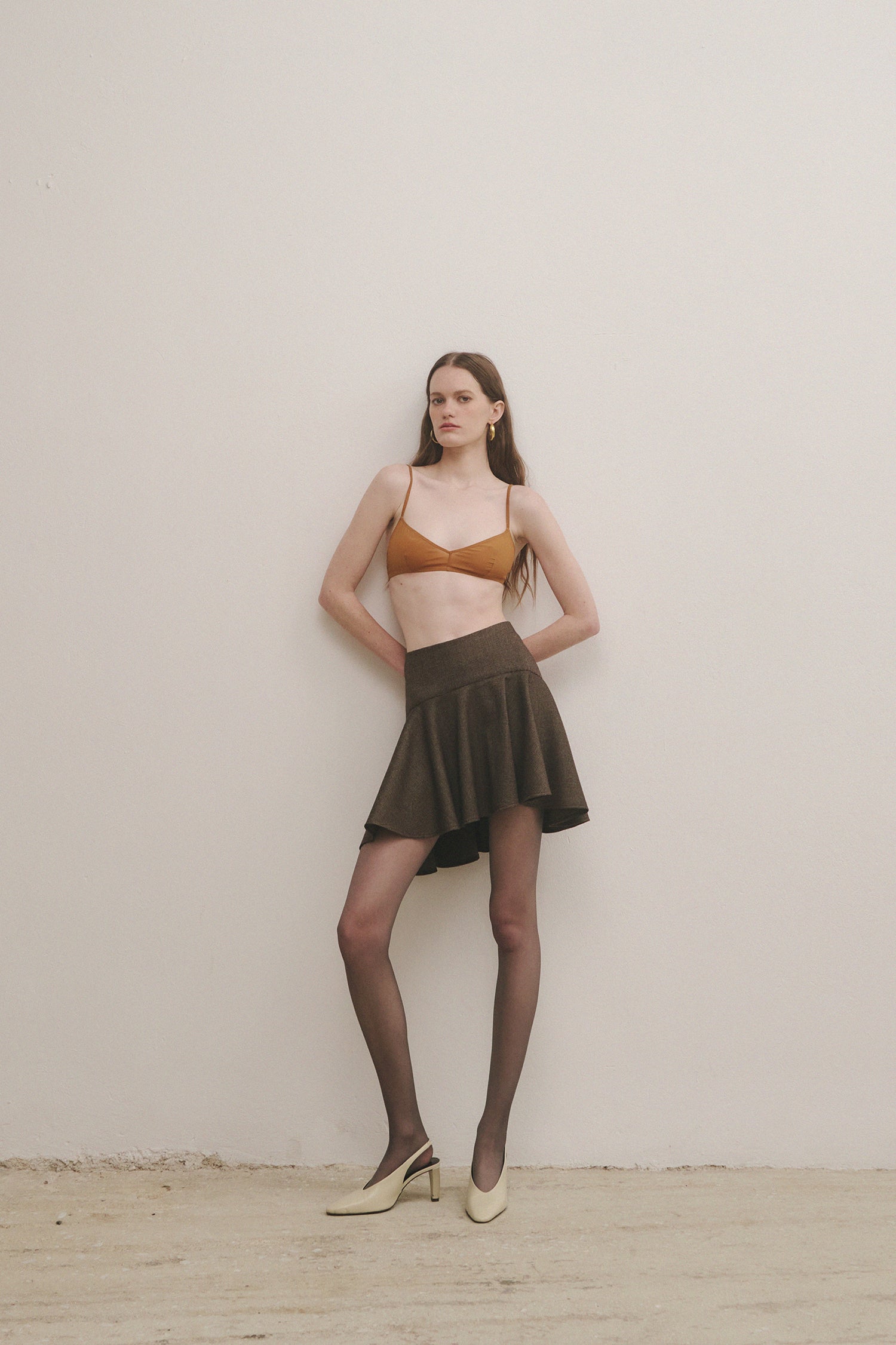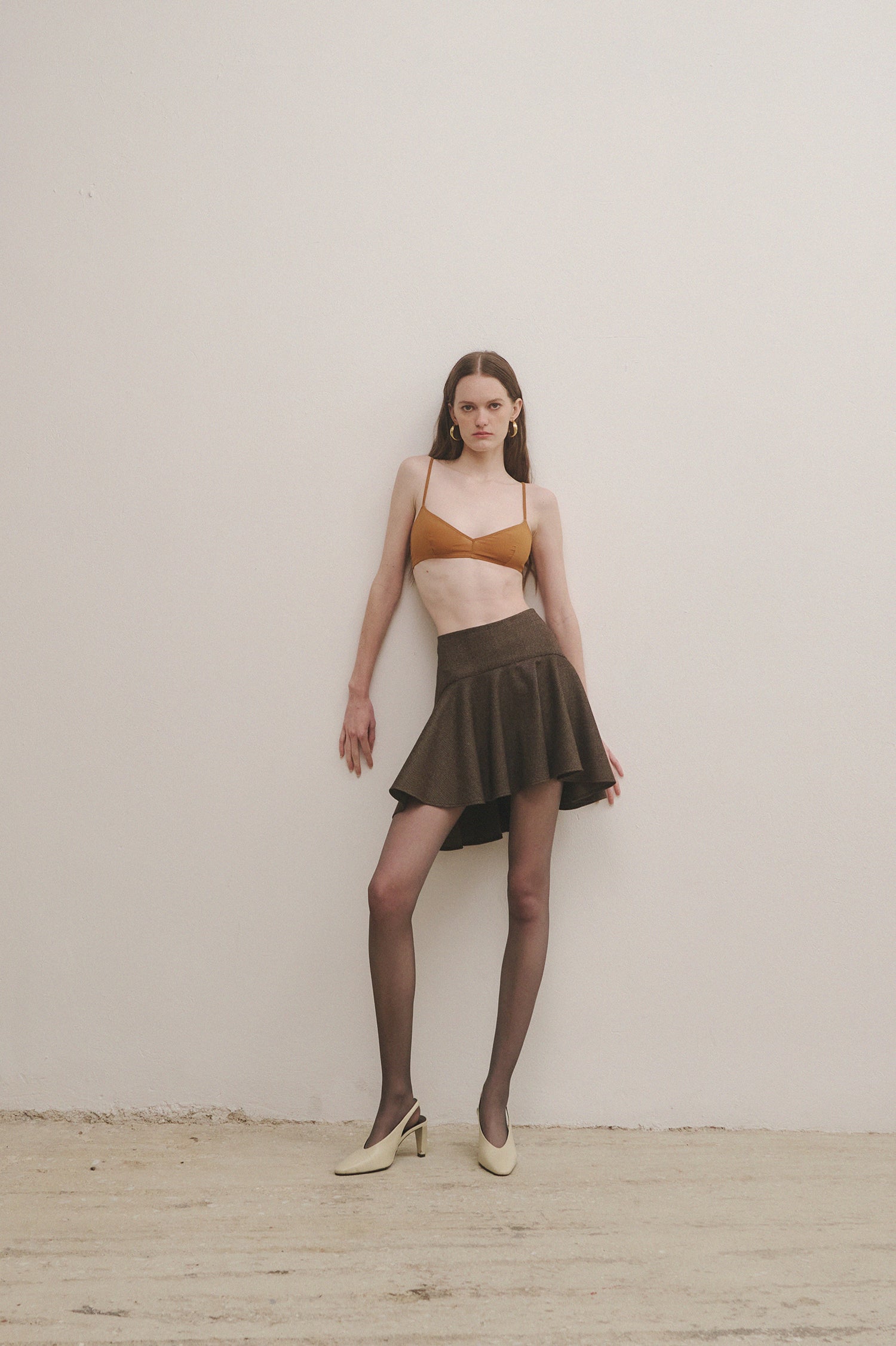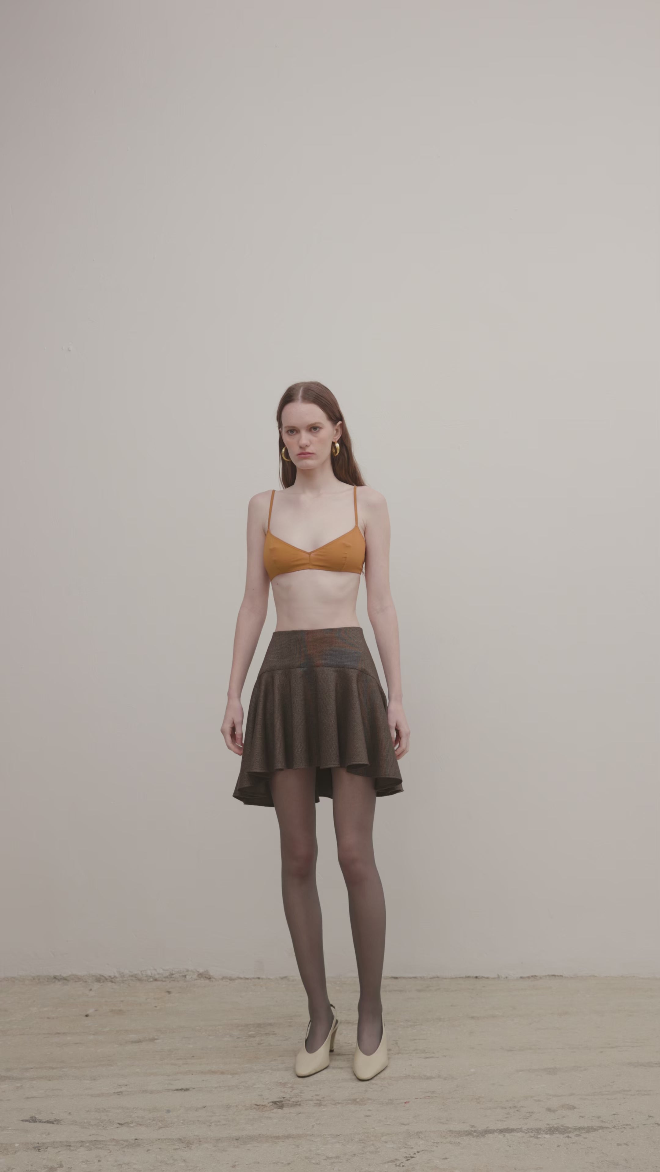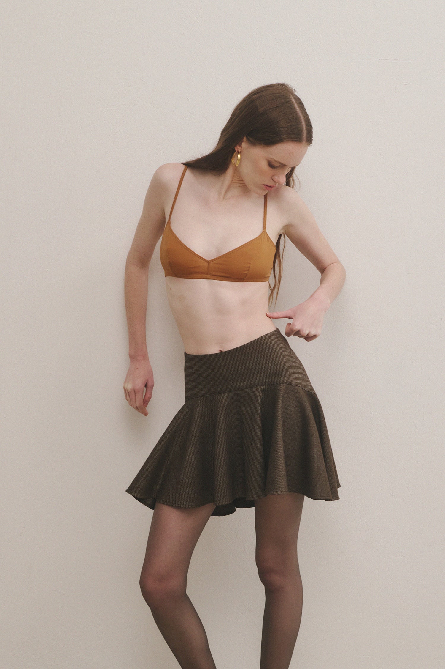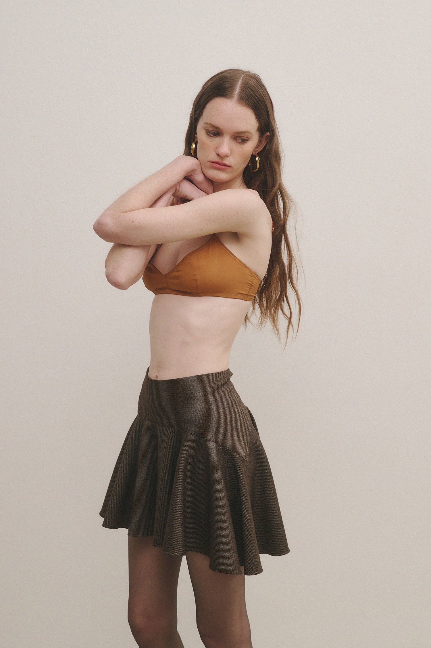 Micro-Checkered Brown Wool Feel Mini Skirt. The new version of the AS Closs Skirt is lower in the sides, creating a comfortable fit for its lenght. Featuring a hidden zipper in the back.