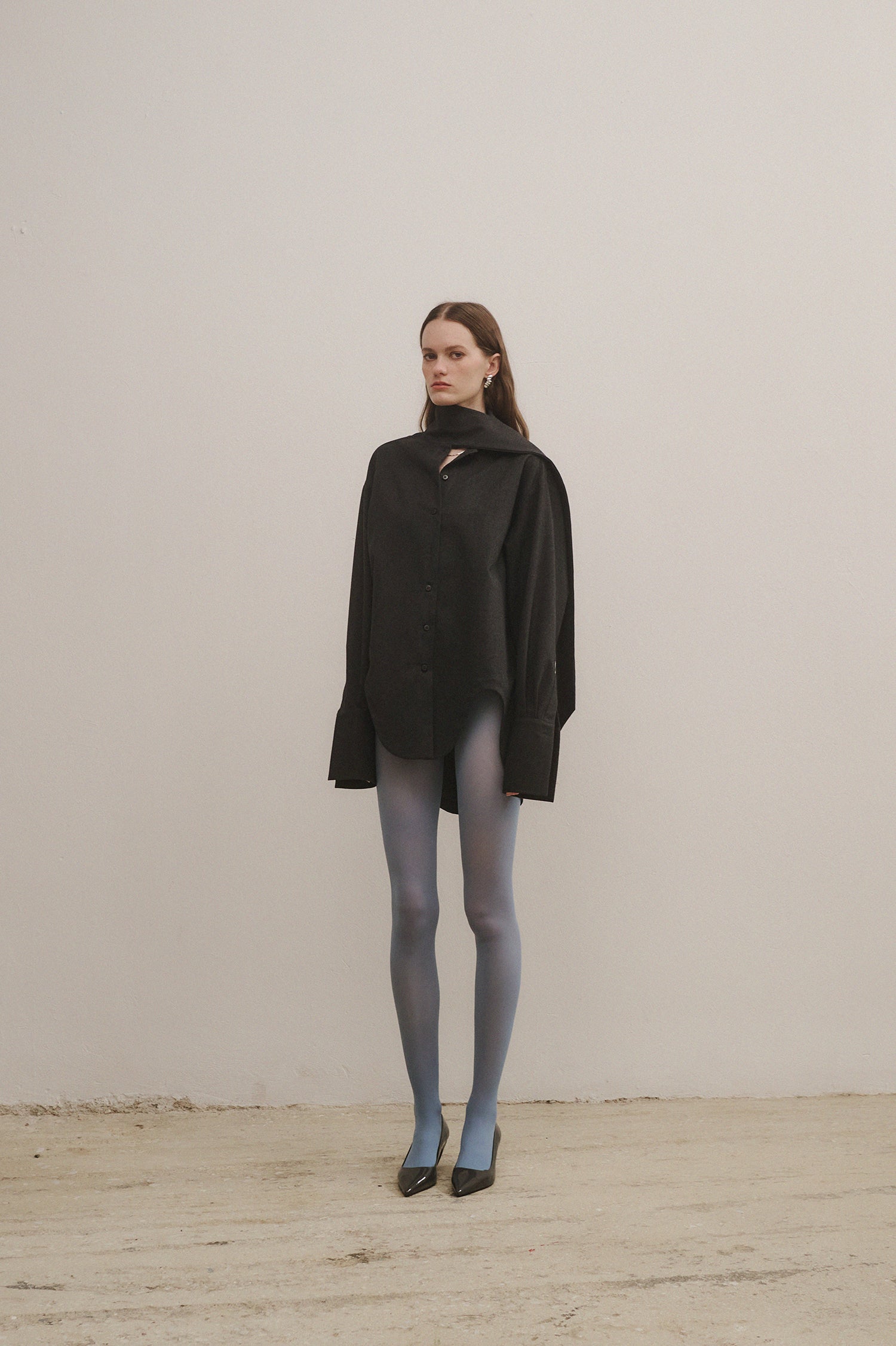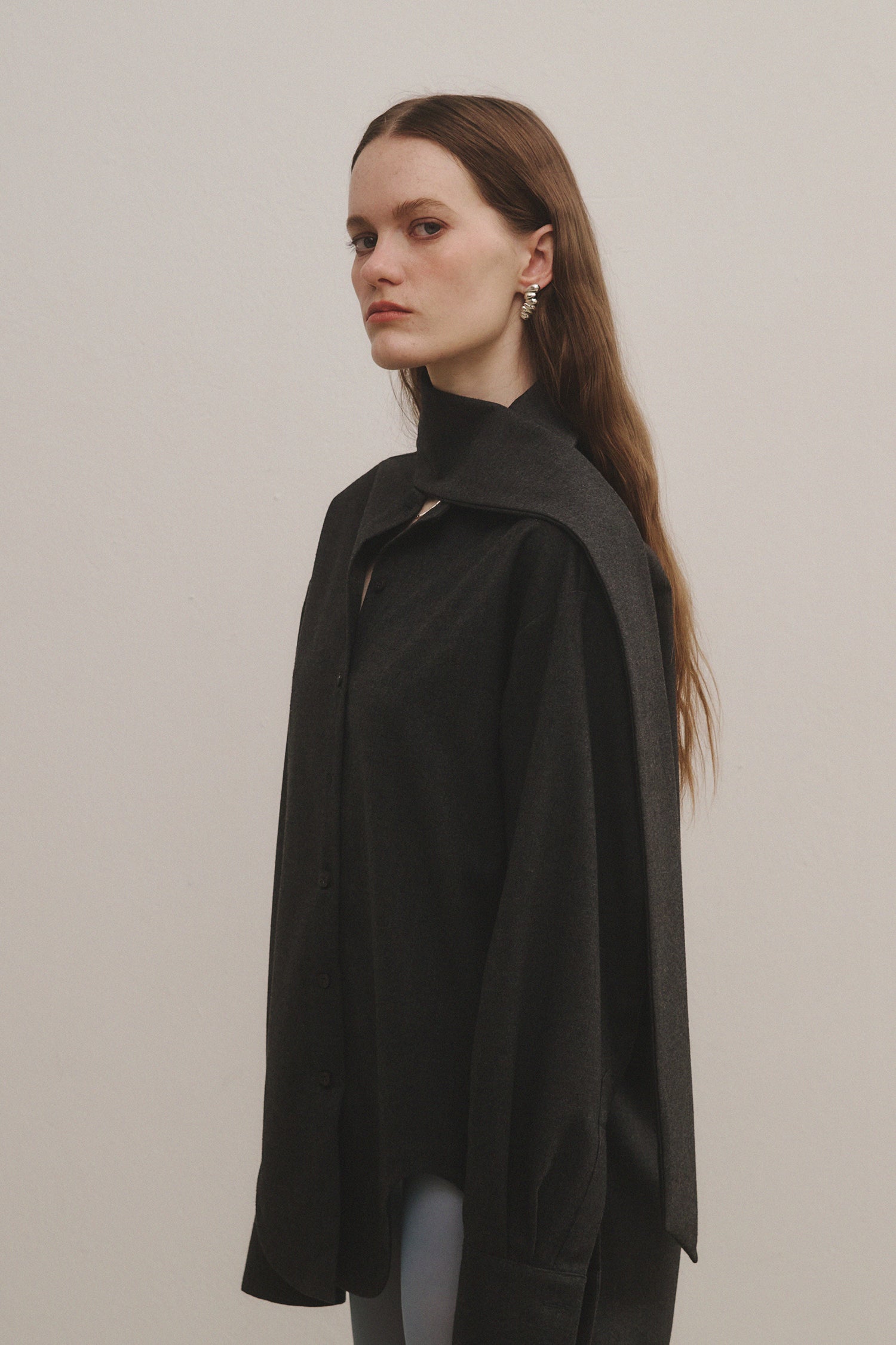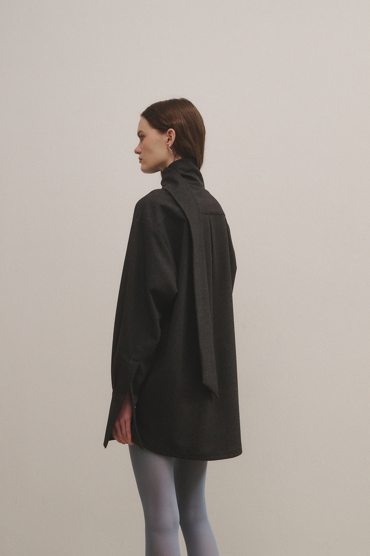 Made of flannel fabric, the scarf shirt follows the signature cut of Athenee Studios, featuring an integrated scarf collar.