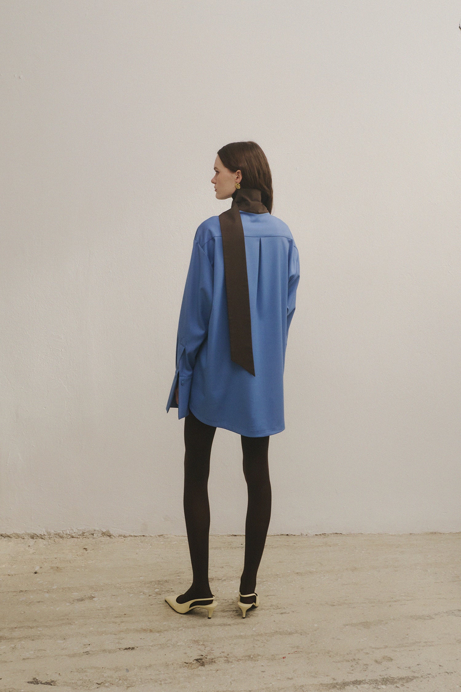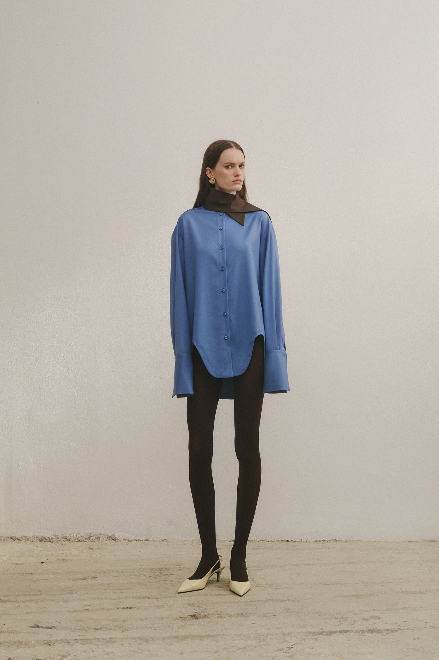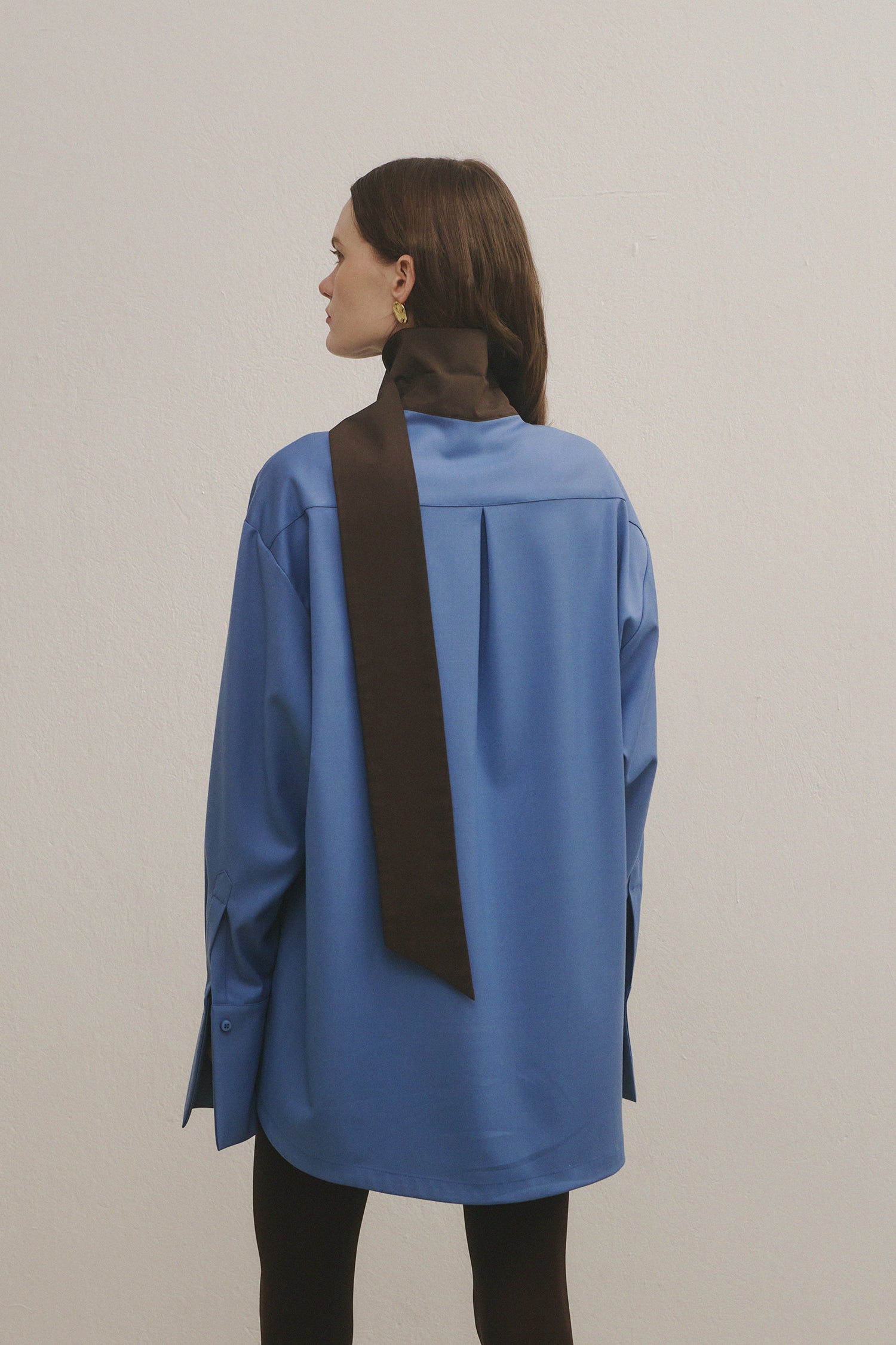 Made of fine feel lightweighted fabric, the scarf shirt follows the signature cut of Athenee Studios, featuring an integrated scarf collar.